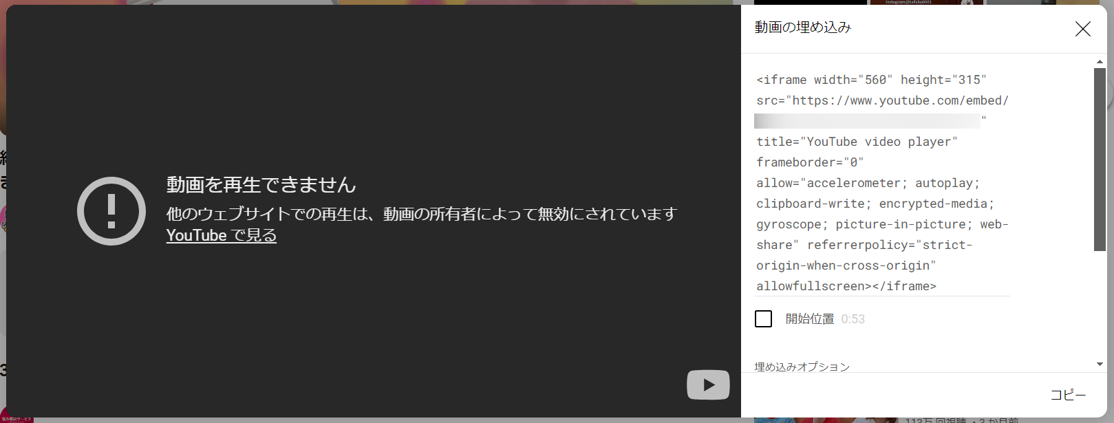 - 「共有」ボタンから「埋め込む」ボタンを押し、HTMLコードを利用しようとする→その場で「動画を再生できません」と表示される